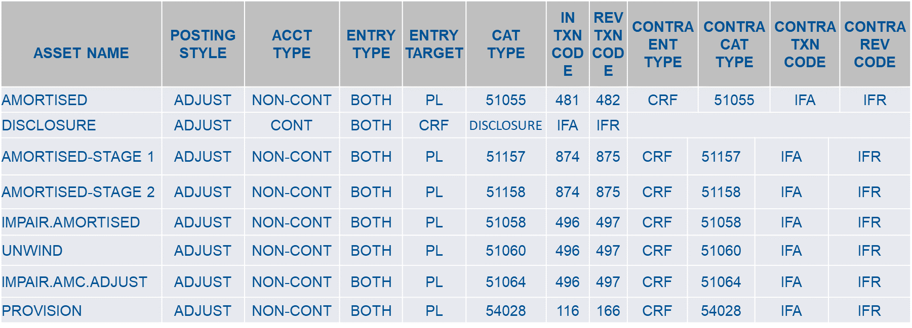 • User can specify different asset types, as per regulation, that can be AMORTISED, FAIRVALUE, DISCLOSURE, IMPAIR.AMORTISED, UNWIND, IMPAIR.AMC.ADJUST, IMPAIR.FAIRVALUE, IMPAIR.FV.ADJ.INC or IMPAIR.FV.ADJ.DEC and CURE.INTEREST.