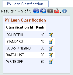 The PV.LOAN.CLASSIFICATION id is the risk classification that indicates the risk level of the contract or the customer and will be used to allocate the percentage for provision. A risk classification will be assigned to the contract and customer by the classification process.