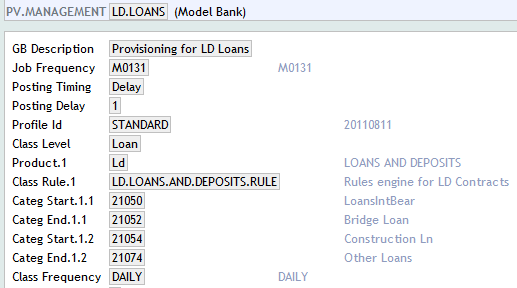 Provision Management (PV.MANAGEMENT) defines when the provisioning process should be triggered, what products are subject to assessment, the rules used to determine the classification and the provision calculation. The system allows multiple PV Management records to be created, thus allowing different classification and provisioning rules for different groups of products. For example, commercial loans may be treated differently to personal loans.
