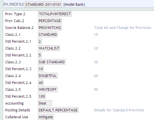 The provision profile (PV.PROFILE) contains definitions of the type of calculation to be performed, the base balance type for provision calculation and provision percentage applicable for the respective balance type and risk classification.