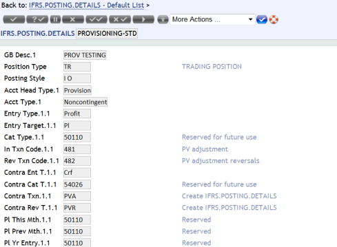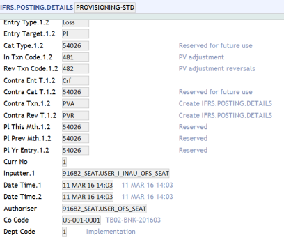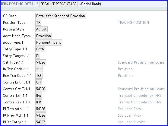 The IFRS.POSTING.DETAILS table stores details relating to the way accounting entries are generated to make the contracts compatible with the IFRS requirements. These are also used for provisioning. Different records are required for IFRS and standard provisioning because different Position Type is used for each one.