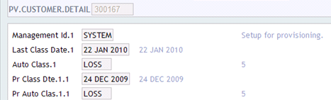 The updates to the PV.CUSTOMER.DETAIL application, which excludes non-manual processing of records, are updated on the same day if the classification passed is worse than the existing one. This record shows the previous, last classification and classification dates.
