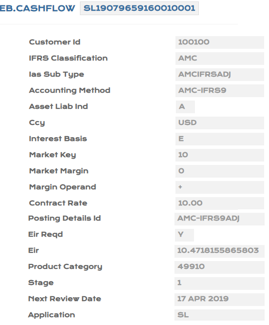 It stores the cash flow information. When MM, LD, SL, AA and BL deals are entered and authorised, an EB.CASHFLOW record is created, which contains details of the deal, the cash flow, the Effective Interest Rate (EIR), stage of the contract, next review date for the system to initiate IFRS 9 processing.