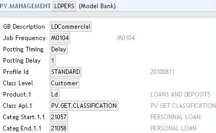 PV.MANAGEMENTrecords can be defined for individual products. This allows the bank to set up classification and calculation rules per product. In the following example, records have been created for LD commercial loans and LD personal loans. A product category may only be specified in onePV.MANAGEMENTrecord. ThePV.MGMT.PRODUCT.LISTis an internal table, which holds the list of category Range/Product Group/Product Line defined for an application inPV.MANAGEMENT.