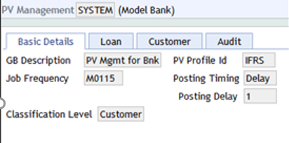The PV.LOAN.CLASSIFICATION id is the risk classification that indicates the risk level of the contract or the customer and will be used to allocate the percentage for provision. A risk classification will be assigned to the contract and customer by the classification process.