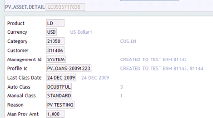 The Manual Class field must contain the Id of a valid PV.LOAN.CLASSIFICATION record. An example of manual input to PV.ASSET.DETAIL is shown below.