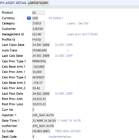 The following screenshot shows the calculated provision amount and the provision loss amount updated in the PV.ASSET.DETAIL.