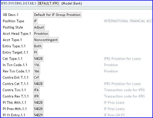 The IFRS.POSTING.DETAILS table stores details relating to the way accounting entries are generated to make the contracts compatible with the IFRS requirements. These are also used for provisioning. Different records are required for IFRS and standard provisioning because different Position Type is used for each one.