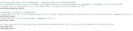 Primary App key and App Secret generated by the above defined Quatum fabric to initiate services to be set in the kony_app_key and kony_app_secret fields.