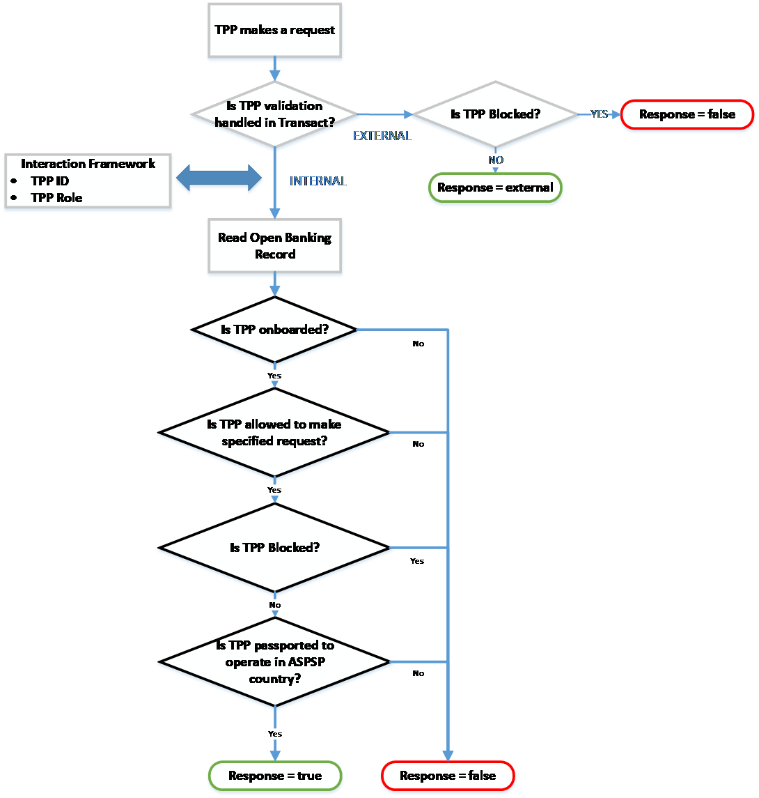 The type of call and the TPPs regulated roles are compared, which are held in the PSP Role field in the PZ.OPEN.BANKING.DIR record.