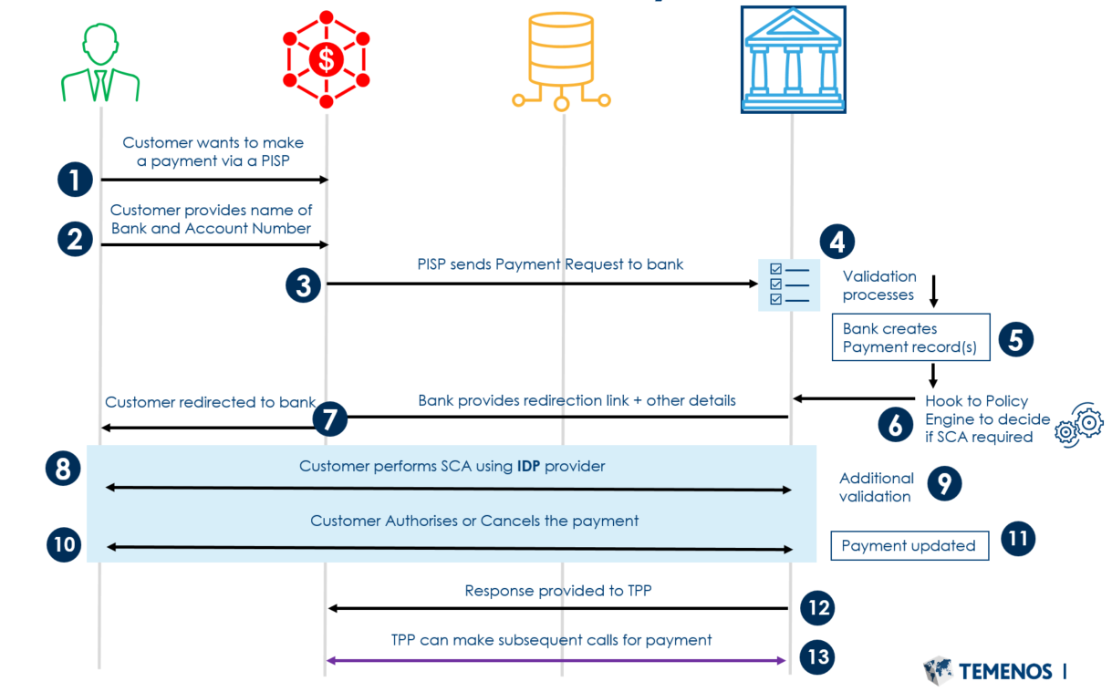 Temenos provides support to allow Payment Initiation through regulated TPPs. Temenos supports the Berlin Group API Guideline. The Berlin Group outlines a set of standardised workflows and APIs/endpoints, which banks can use to facilitate their own PIS flows.