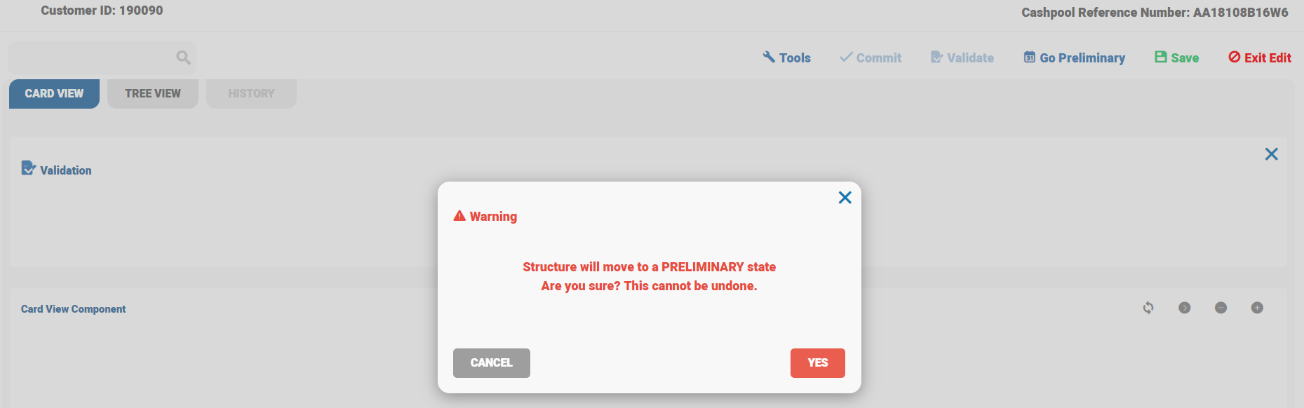 Closing the preliminary BN pool is done online and future scheduling is not possible. Master arrangement and SA, CS, TR or MTR accounts linked to the pool is closed online and Tree or Card view is updated accordingly. GUI displays a warning message to the user before closing the entire BN pool. When the user clicks on YES, GUI passes the information to Temenos Transact and the accounts are closed.