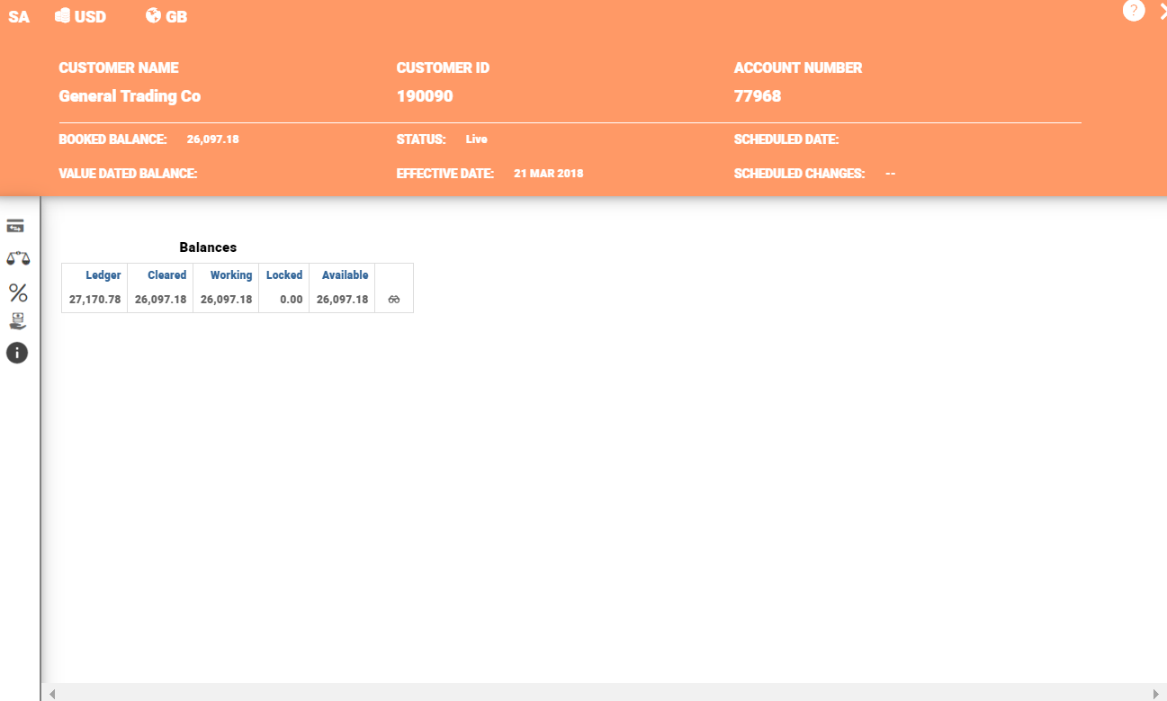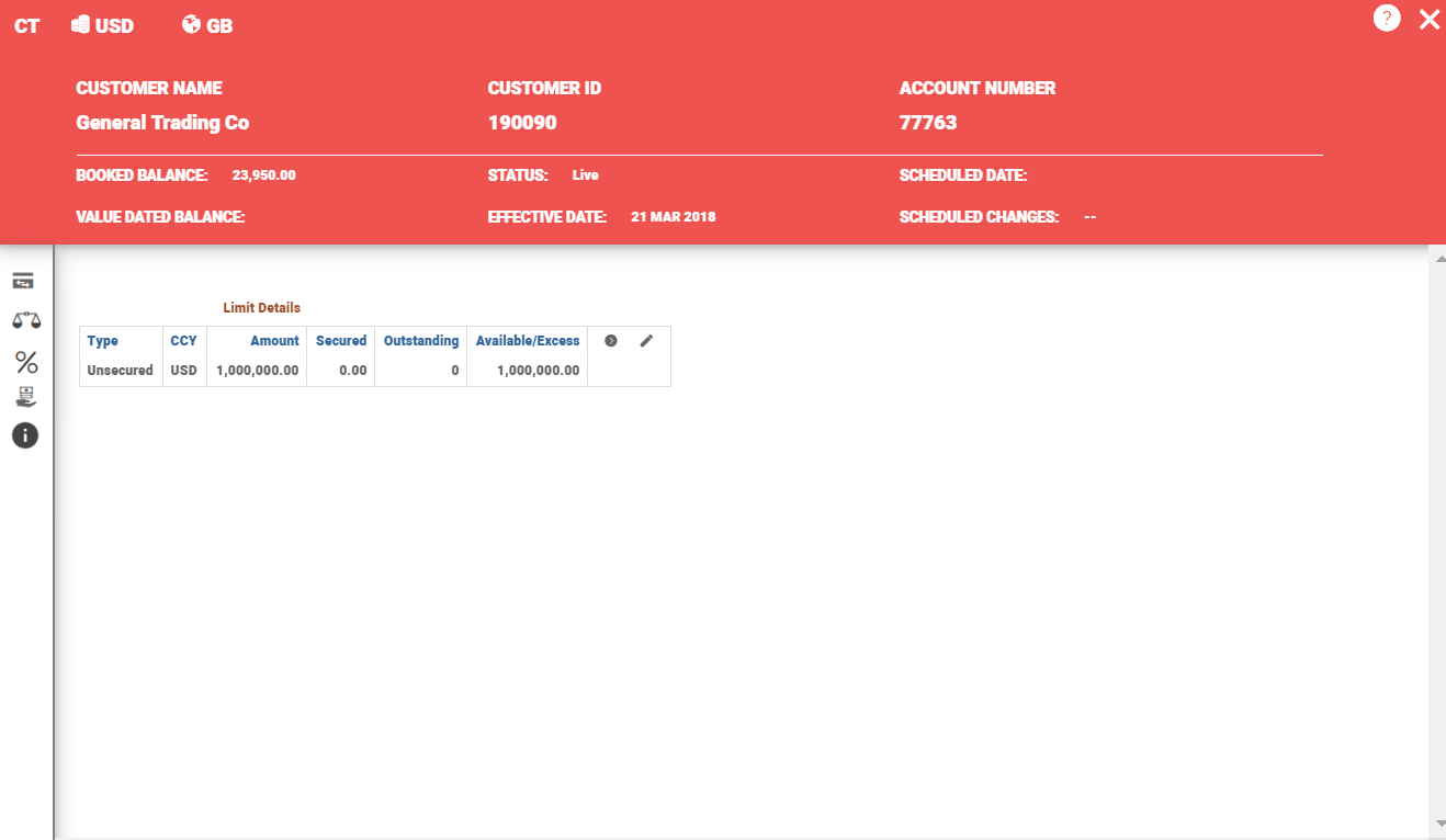 CT accounts provides static information of accounts such as CUSTOMER NAME, CUSTOMER ID, ACCOUNT NUMBER, STATUS and SCHEDULED CHANGES. CT expand card also has an option to setup or amend the interest conditions. When the limit is available for the CT account, GUI allows editing of limit on CT accounts.