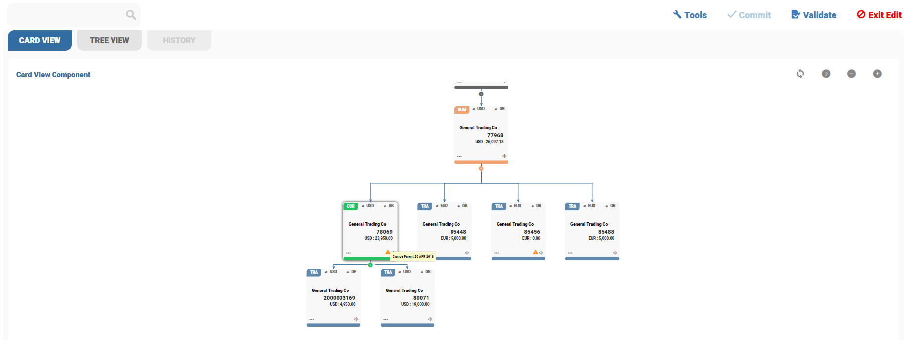 on each cards. The account card is removed immediately from the BN pool structure. When the Summary Account (SA) or Currency Summary (CS) placeholders are removed from BN pool, the child accounts are linked to the immediate parent. The parent accounts can be removed along with the child accounts from BN pool.
