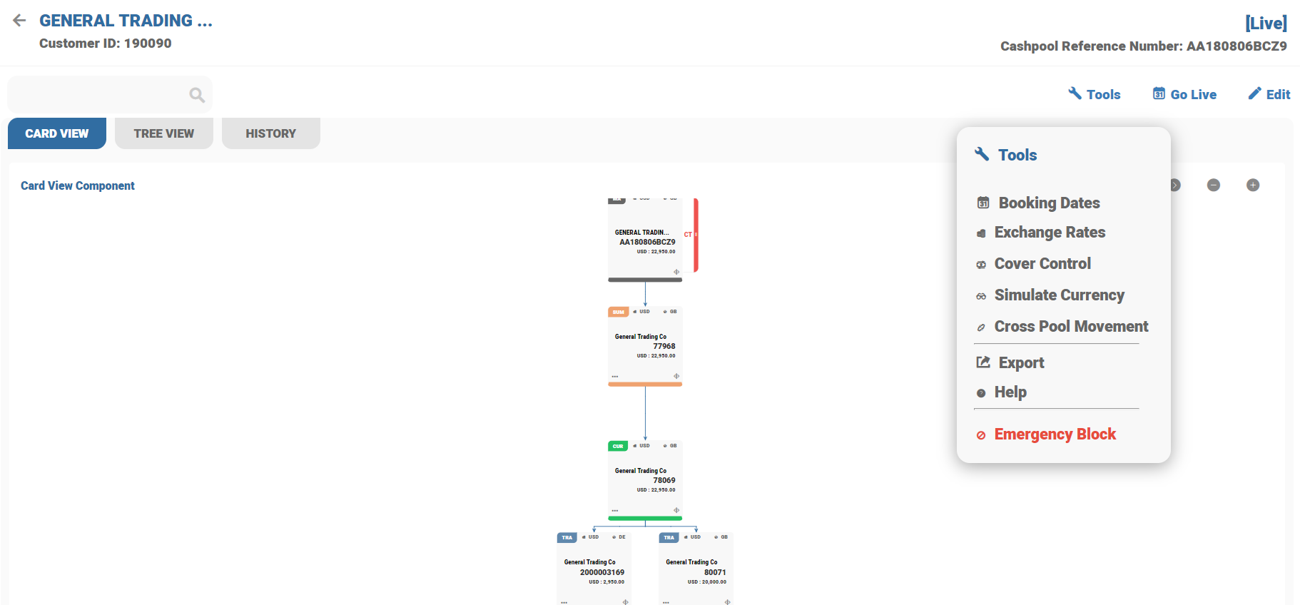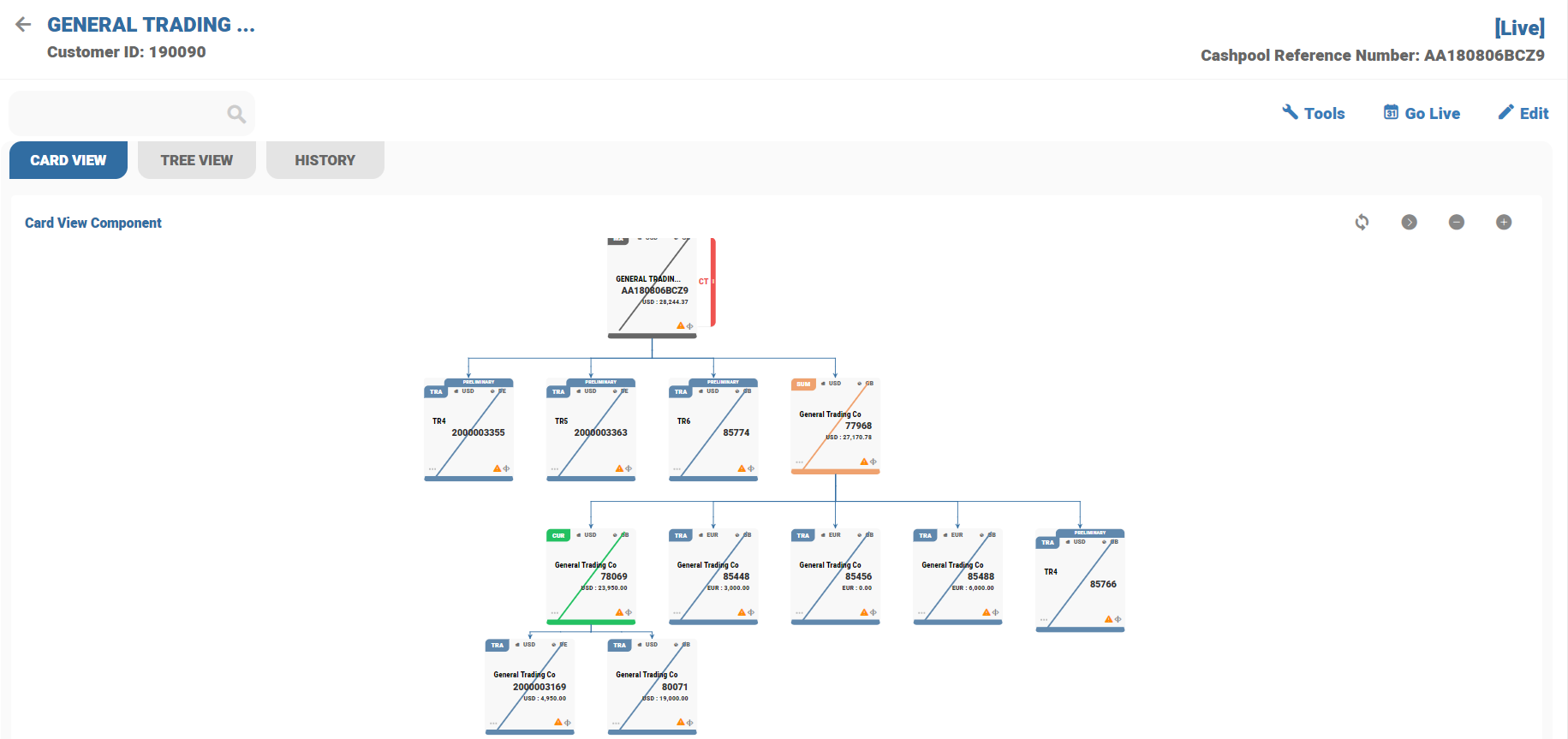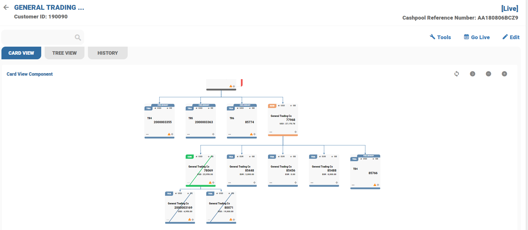 Once the preliminary process completed, the status of BN pool structure is moved and updated as Preliminary. Account number is generated on each placeholder and appears on each cards. Temenos Transact generates CT account automatically for each currency of TR accounts.