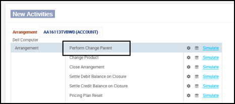 From the New Activity menu in the TR account, the User activity ACCOUNTS-CHANGE.PARENT-ARRANGEMENT is initiated.