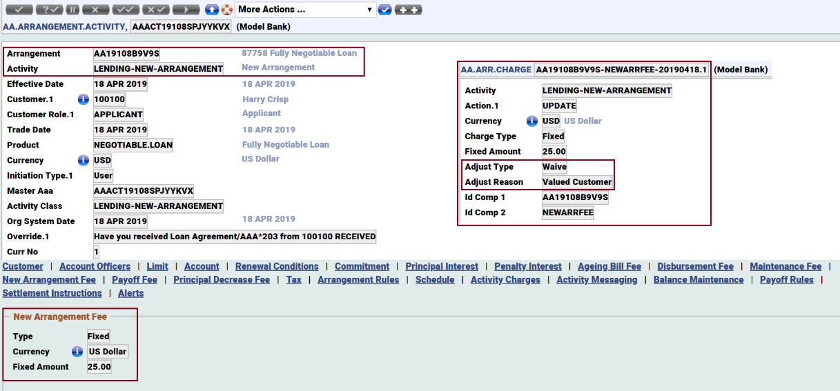 The below screenshot displays the New Arrangement Fee waived off because the arrangement has been created as a Valued Customer.