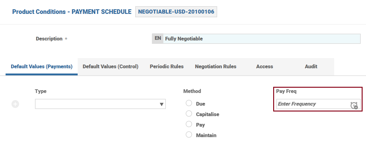 • Payment Freq field - indicates the frequency at which payments are made due.