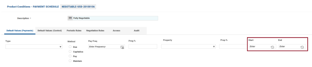 • Start Date field - indicates the actual payment start date. If the start date is mentioned, then the payment frequency is applied on the start date. Else, the system defaults it from the base date. Ad-hoc payment dates can be defined by expanding the multi-value sets and defining the dates in the Start Date field. Payment and Due Frequency fields have to be null. Additionally, an End Date or Number of Payments can be specified to indicate when the payments should terminate.