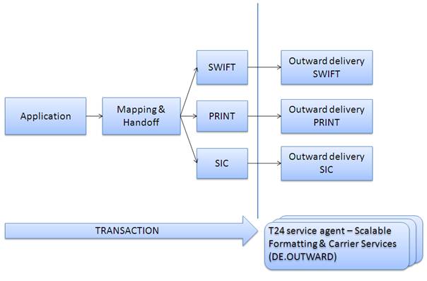 The outward delivery messages generated by the Temenos Transact applications follow the flow shown below.