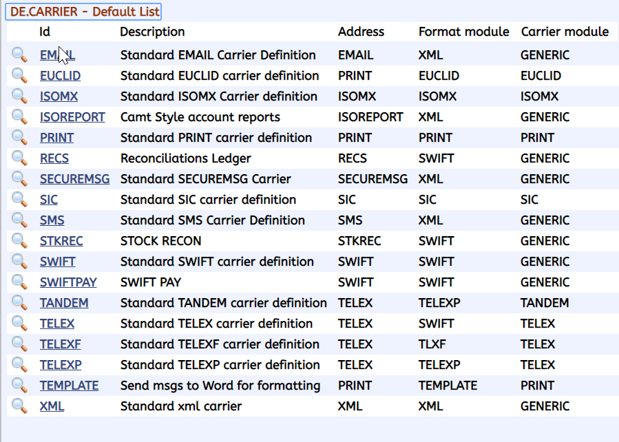 DE.PARM affects only the remaining phantom services, the newer services are controlled using the TSA.SERVICE records.The DE.CARRIER application contains the details of all carriers available in the DE module. The bank need not amend this application, unless new interfaces are required to be linked to the delivery system. The user must specify the carrier in the DE.PARM application, to enable the carriers specified in DE.CARRIER. The ID of DE.CARRIER is the name of the carrier, as used in DE.PRODUCT.