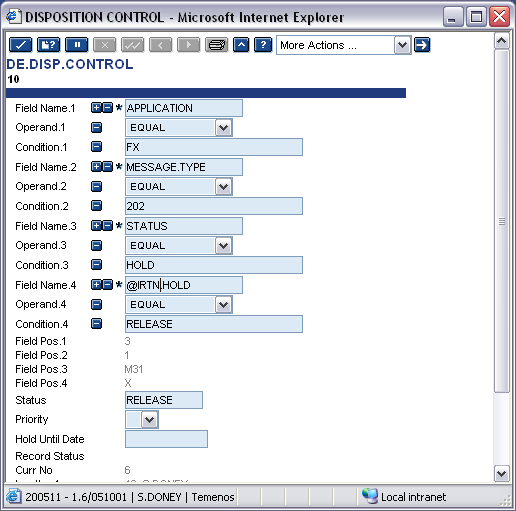 When a new or amended DE.DISP.CONTROL record is authorised, the Msg Disposition or Msg Status field in the DE.I.HEADER and DE.O.HEADER records for each message that has been successfully formatted but not sent (messages not in the repair queue) is amended, if the information in the DE.I.HEADER and DE.O.HEADER records match the conditions defined in that DE.DISP.CONTROL record. This involves examining numerous queues and application in the delivery system and could take some considerable time.
