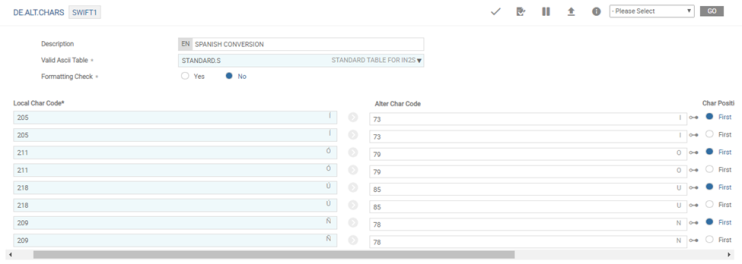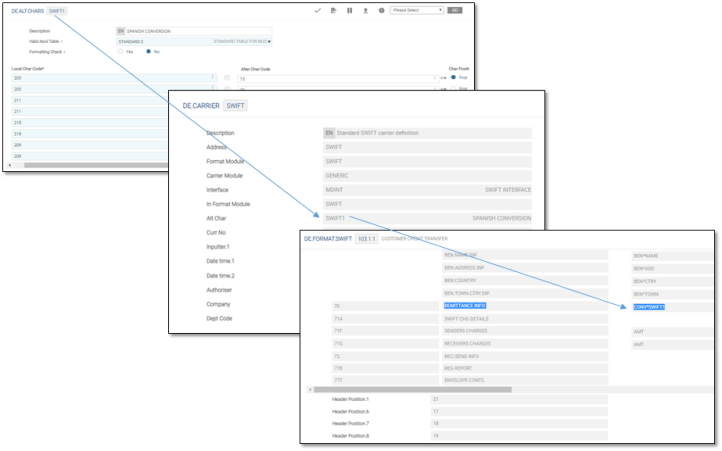 The DE.ALT.CHARS application holds the character mappings for the replacement of language specific characters to SWIFT acceptable characters.