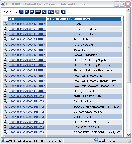 The DE.ADDRESS application contains the names and addresses of a bank customers, and also the details of each company within the banking organisation. The basic postal address of each customer is automatically updated, when the address is changed through customer maintenance (CUSTOMER application). A record is created in the DE.ADDRESS application with ID as COMPANY ’.C-’ CUSTOMER ’.PRINT.00001’