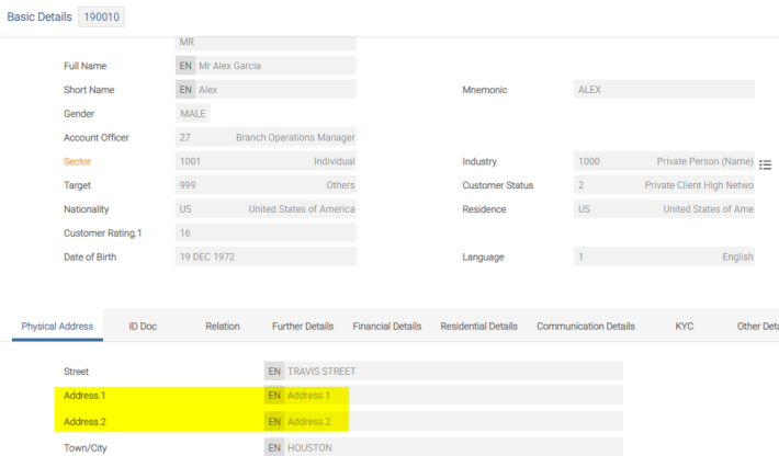A multi-value Address field is available in DE.ADDRESS. When the customer’s main address is updated, the DE.ADDRESS PRINT.1 record is updated by copying the address lines from the CUSTOMER record to the DE.ADDRESS PRINT.1 record. For all other DE.ADDRESS records, the Address multi-value field is manually inputted.