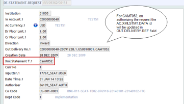 The DE.STATEMENT.REQUEST process takes care of assembling the data and triggering the camt.052 generation. Once the camt xml message is successfully generated, the link to the AC.XML.STMT.DATA is recorded in the Out Delivery Ref field.