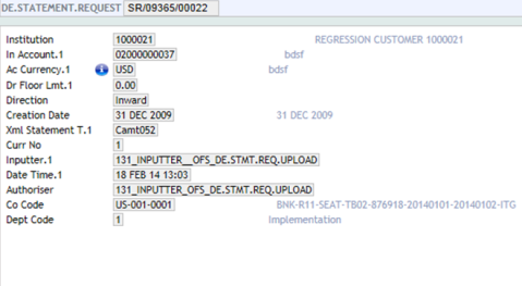 The following screenshot shows a view of DE.STATEMENT.REQUEST record where a camt.052 has been generated.
