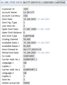 The Temenos Transact xml format is recorded in the AC.XML.STMT.DATA table. This table holds the basic details for the camt statement being processed.