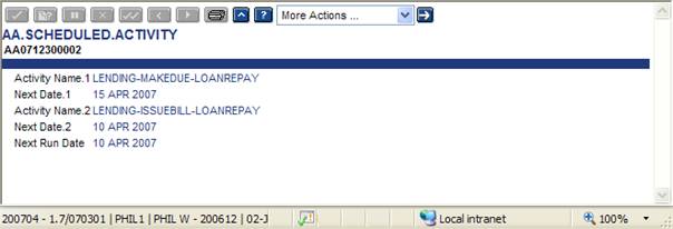 These details are maintained in AA.SCHEDULED.ACTIVITY. The details are updated as part of the activity processing for arrangement property maintenance and the scheduled activity itself. For example, the creation of a new loan contract updates the next scheduled MAKEDUE activity when the PAYMENT.SCHEDULE is initially defined or subsequently modified. The MAKEDUE activity itself cycles forward to the next due date and ensure that AA.SCHEDULED.ACTIVITY reflects this.