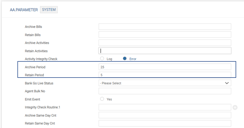 • Retain Period (RETAIN.PERIOD) - This field indicates the number of Period Start and Period End set of values that need to be retained in the AA.INTEREST.ACCRUALS table, when the archiving is performed .It prevents the AA.INTEREST.ACCRUALS table from getting empty by retaining a certain number of Period Start and Period End set of values in the live table (AA.INTEREST.ACCRUALS). As an example, the user may prefer to archive when the Period Start and Period End count is greater than 25 (set in Archive Period field). But, they user may choose to retain the last 5 Period Start and Period End set of values along with their respective From Date and To Date set of values, so that there is some residual content in the live table and it is not completely empty.