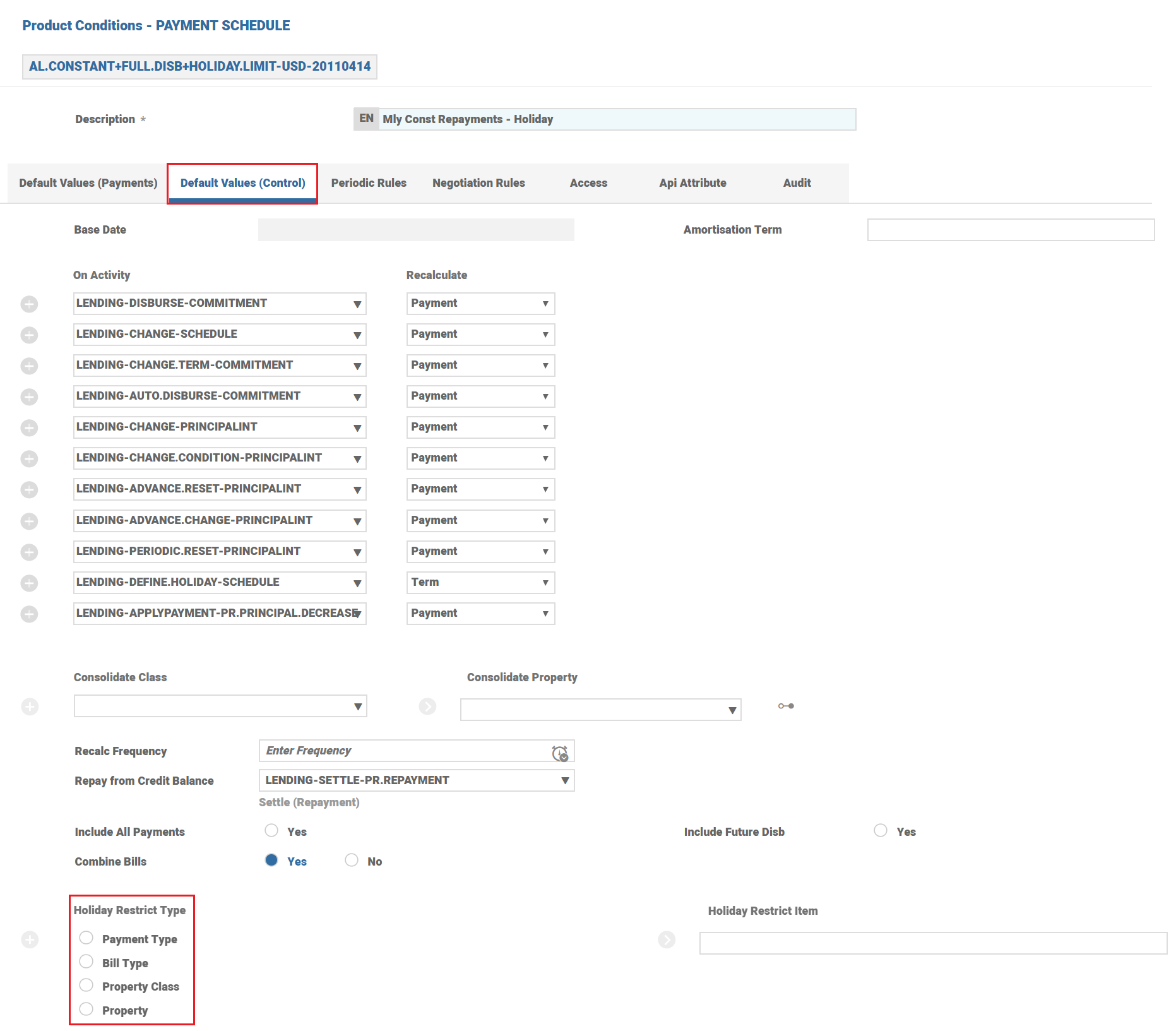 The Payment Holiday is a transaction (soft) Property Class which is used to skip an installment completely or skip part of the installment amount for a defined period.