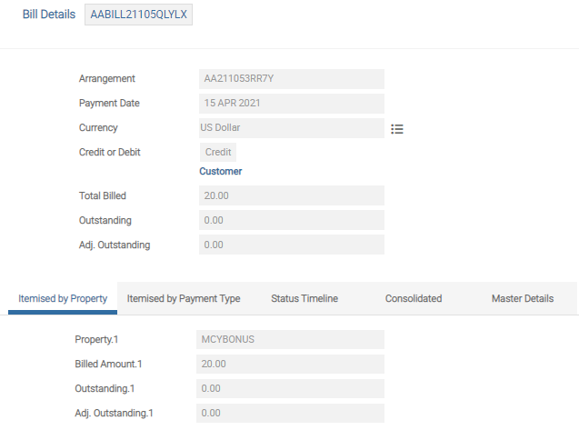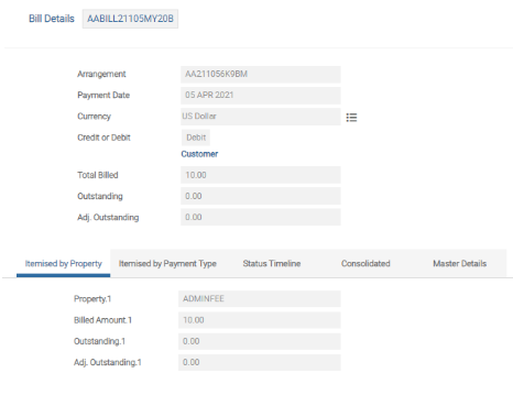 The debit and credit Bill Details Overview display the charge amount, corresponding settlement account ID and charge property name.
