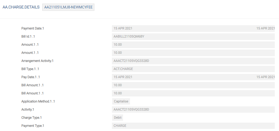 In the MCY arrangement, the charge and bill info details are shown below.