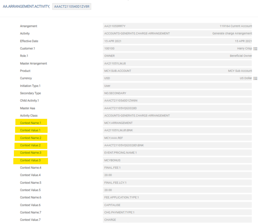 It is possible to collect an account opening fee as an activity charge at the time of MCY arrangement opening. As the base currency account has to be opened automatically, the charge is collected from the base currency sub-account. In the below example a MCY arrangement is created with a debit and credit charge defined during MCY account creation. The following are defined: