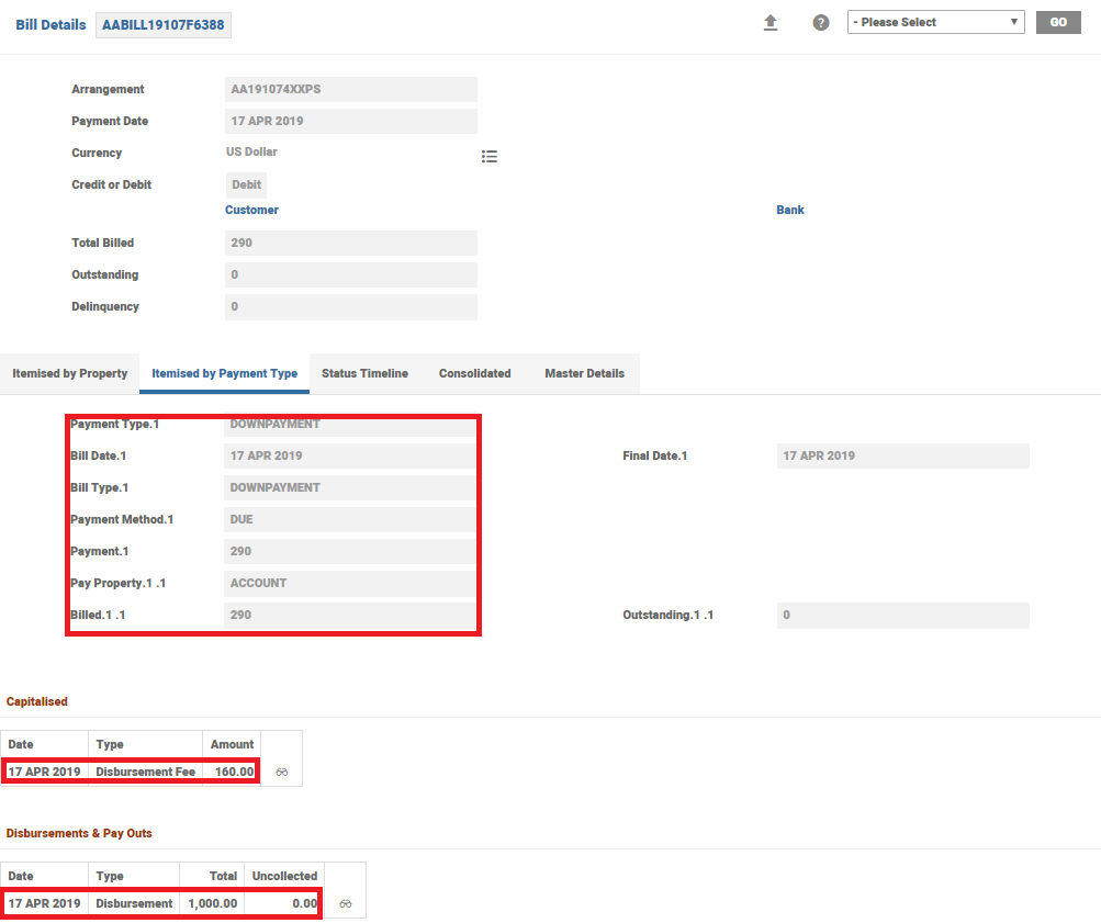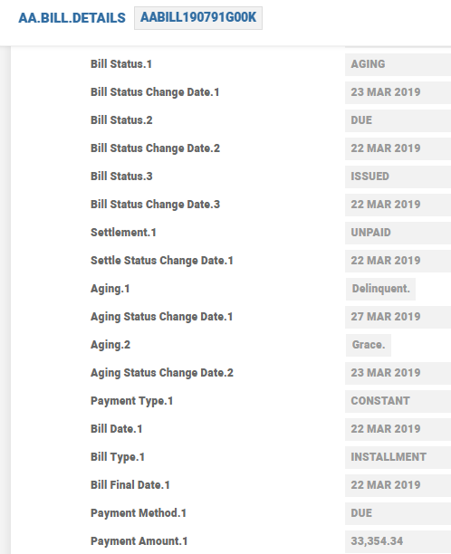 An illustration of another contract where a bill is settled is shown below. The details of the principal, interest and the tax settled are seen in the AA.BILL.DETAILS.
