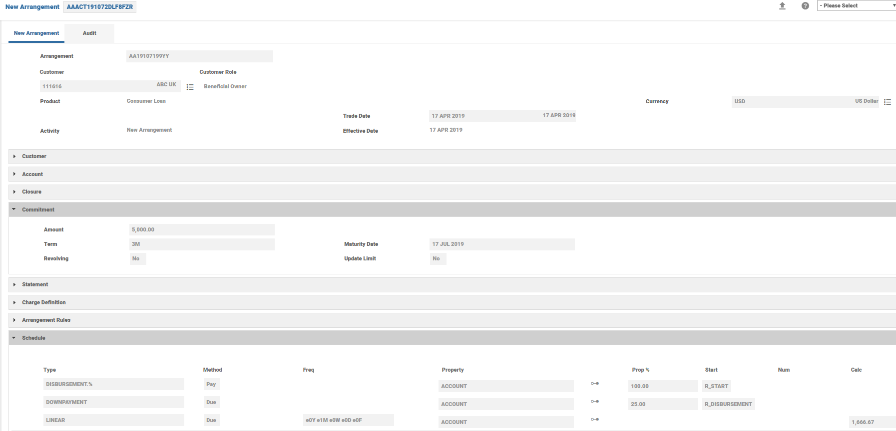It is possible to pre-construct the schedule configurations and set defaults in the Payment Schedule conditions of the arrangement. Banks can offer a unique amortisation plan to customers to repay a specific different percentage of the principal-only repayment over a certain period, for the granted loan amount. This could be tedious to define it every time at the arrangement creation. The option of setting default values to Payment Schedule feature minimises the overwhelming operations maintenance overhead when a unique percentage has to be populated for arrangements without having to repeat them for every arrangement.