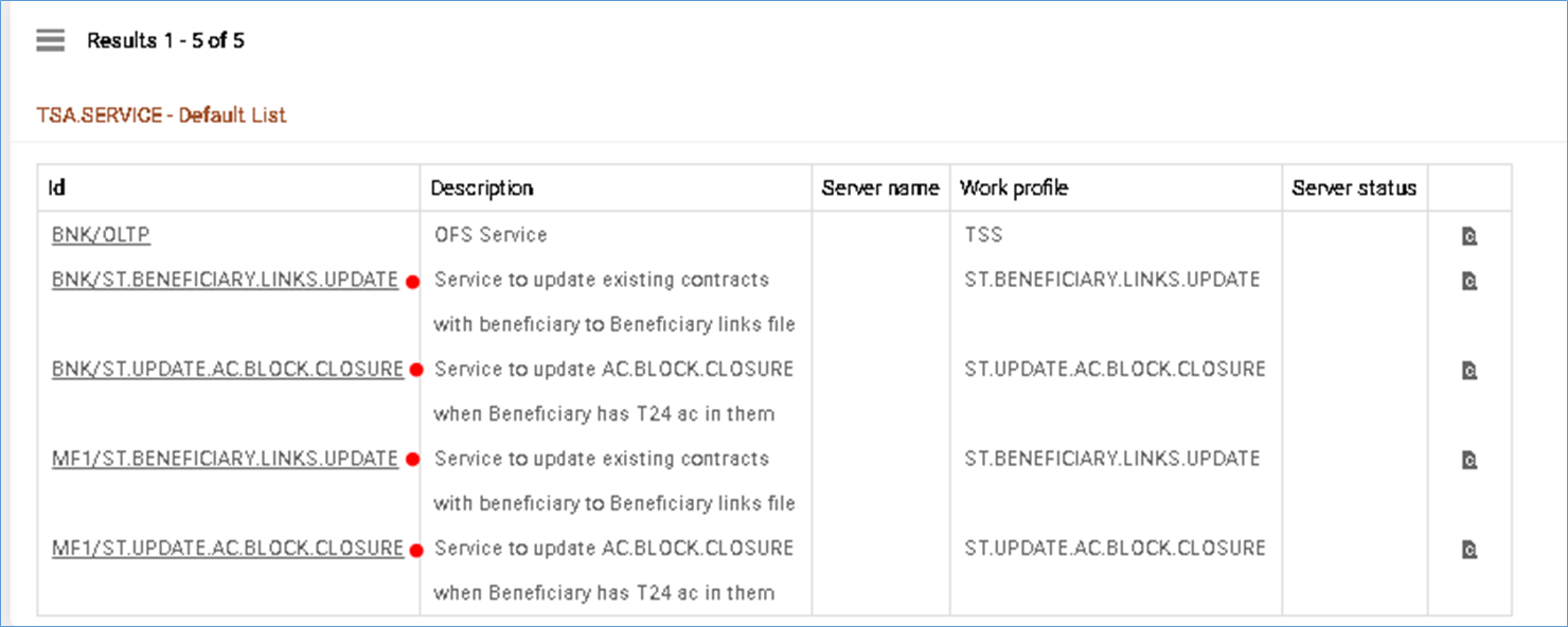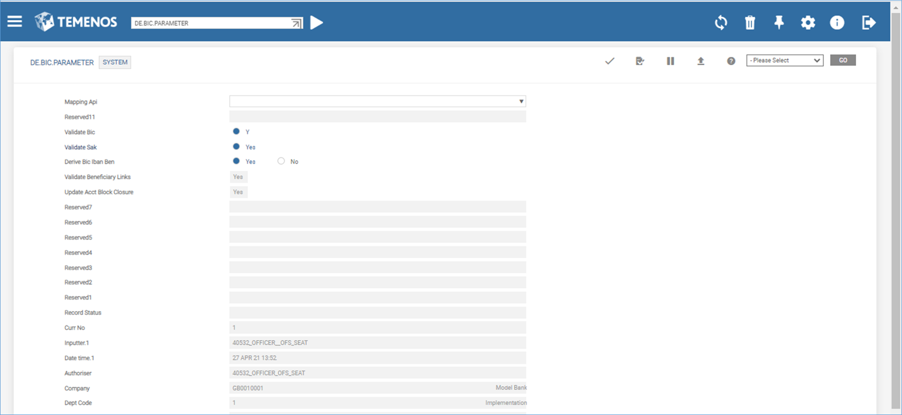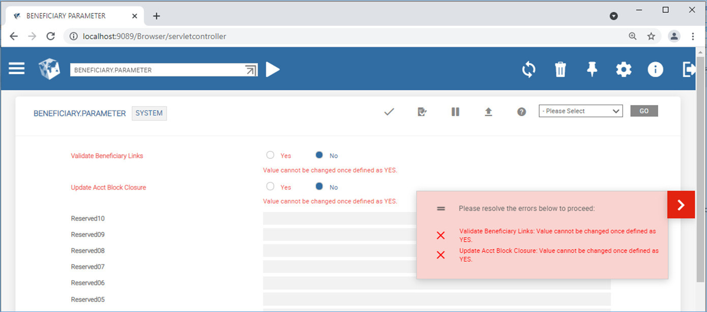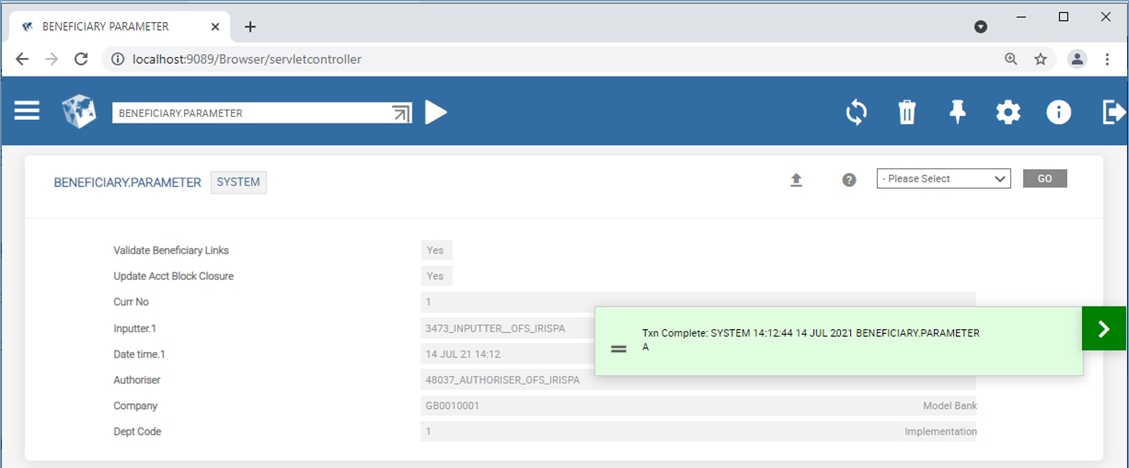 After the system record is created in BENEFICIARY.PARAMETER application, the Validate Beneficiary Links and Update Acct Block Closure fields in the DE.BIC.PARAMETER.RECORD application are updated with the values of the corresponding fields from the BENEFICIARY.PARAMETER application and are marked as No input.