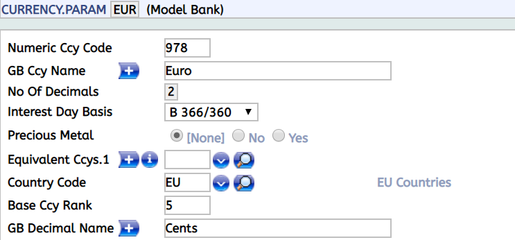 This application allows the user to define the common characteristics of Euro. In addition, Base CCY Rank must also be defined. |