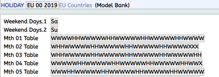 This application allows the user to define the public holidays for EU, for the calendar years over which the bank's current business is spread. |