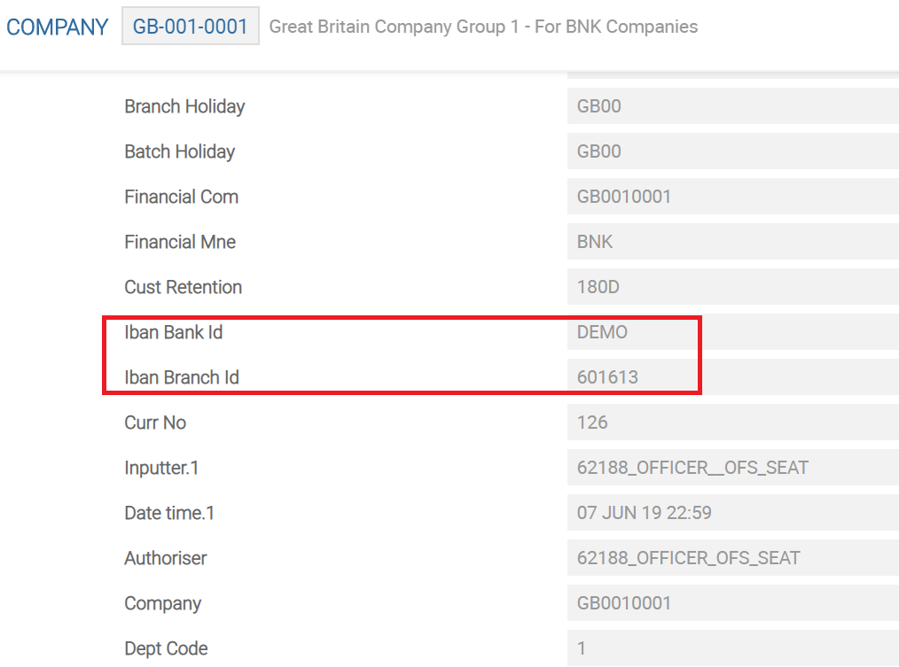 Iban Bank Id and Iban Branch Id fields in the COMPANY application are used to define the bank identifier and branch identifier for the company and as per the IBAN Structure of the country.