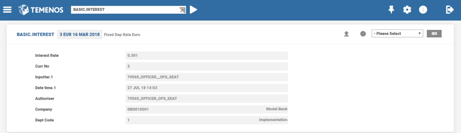 This centrallystored table defines the floating rates, such as base rate, prime rate, overnight rate, and so on from where Temenos Transact applications can access as required. The interest rate type applicable for an account or contract can be fixed or floating. Ifthe interest rate type is floating, then BASIC.INTEREST key along with the spread (if any) details are available on both transactions and PM.TRAN.ACTIVITY records. During run time, the enquiry fetches the present basic interest rate from BASIC.INTEREST table (using the BI reference mentioned on the PM.TRAN.ACTIVITY record) and add or reduce the spread (if any) to construct the PM enquiry.