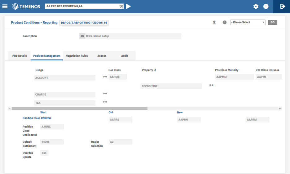 Property Class and Property Id fields are multi-value fields. Property class or Property ID that impact the PM data are included along with the Position classes relevant to Property class or Property. Optionally, the Position classes can be defined for a Property class, in which case all the properties of that class would go with the same position classes. In case of Interest property class, it is advisable to define interest property-wise only so that any other interest properties (such as Penalty) can be excluded. It is observed that some position classes are appropriate for certain property class or property, such as ACCOUNT having AAPMS, AAPMI, AAPMD and AAPMM. Currency in reporting property ID for PM is optional.