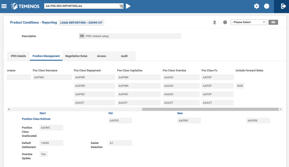 The difference between Mandatory and Optional position classes is the fourth character in a Position class, which is always ‘E’ for Optional position class. System has the intelligence to use either optional or mandatory position classes, based on the certainty about principal funding or disbursal dates. Both the Position classes have to be defined in PM.POSN.CLASS and also included in CAS and GAP records in PM.POSN.REFERENCE, if the PM user opts to include the optional position classes also in PM projections. For example, if the Mandatory position class is built with AAPMS (start event for a loan or deposit with timing certainty), an Optional position class is built with AAPES (start event with no timing certainty).
