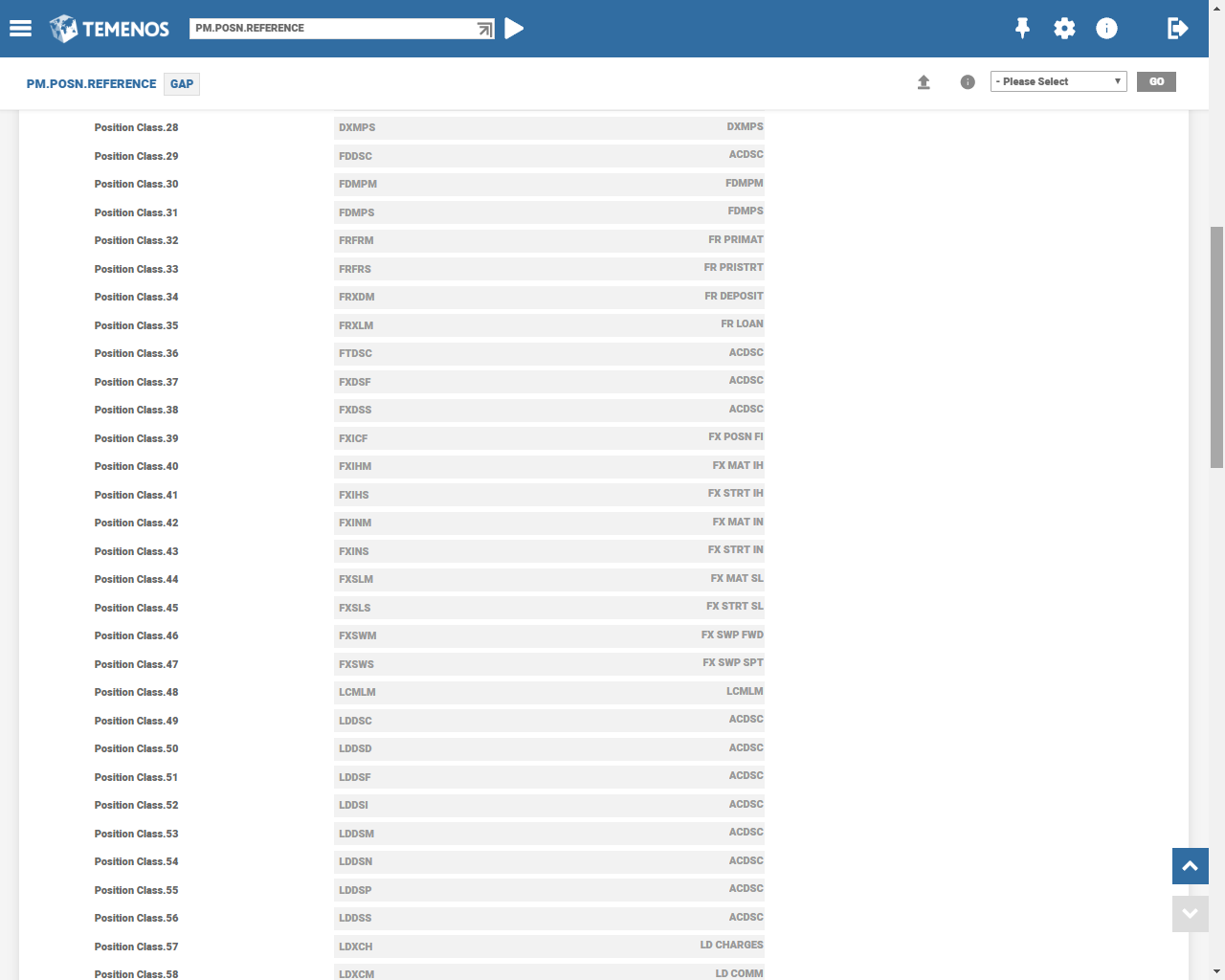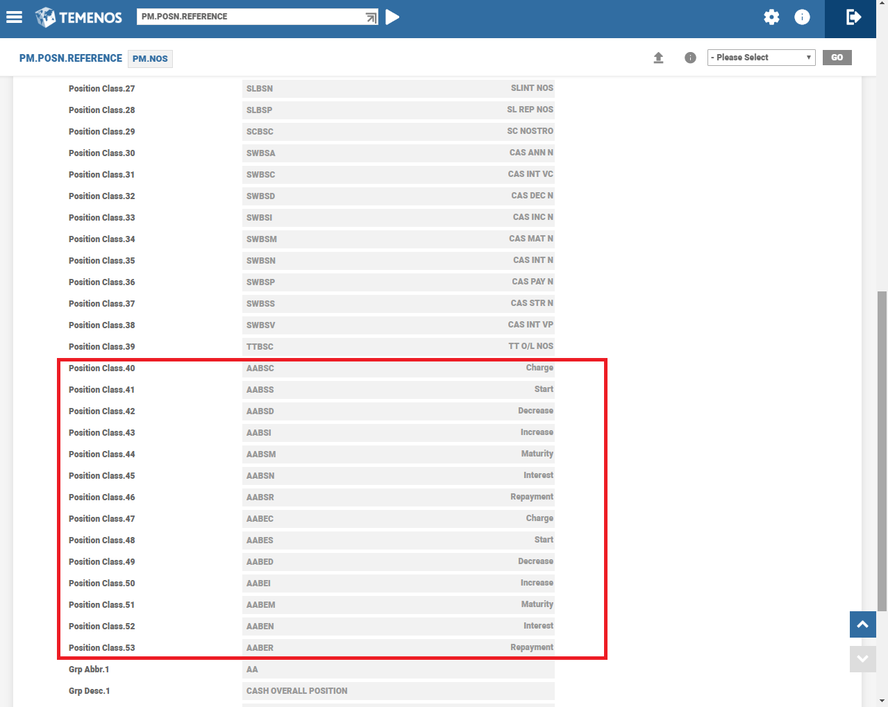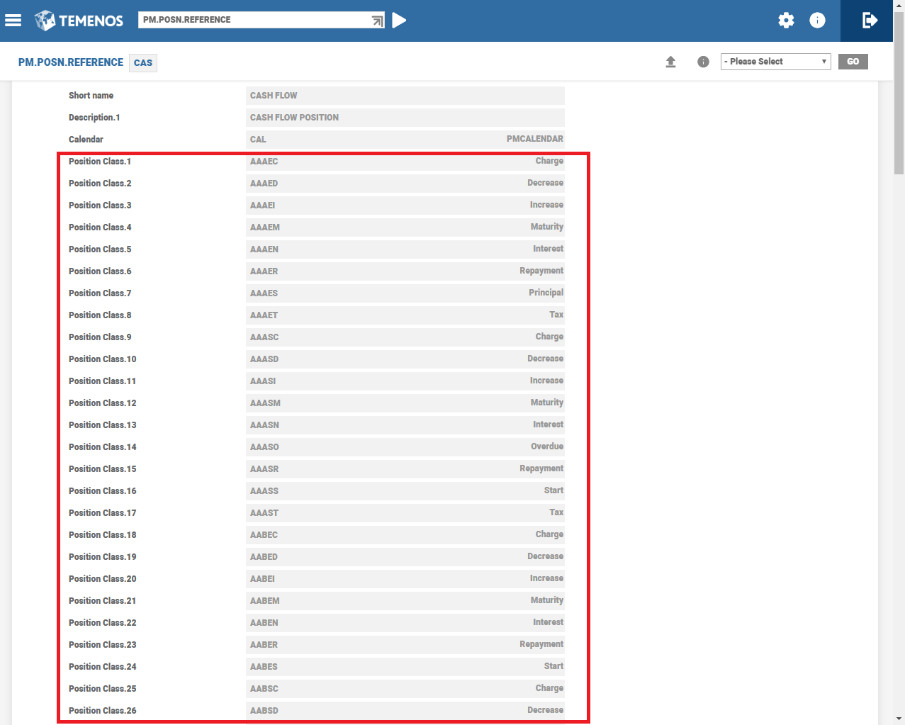 The following table has the sample Position classes for AA to PM. The user can define the GAP and CAS Position classes relating to UNC, overdue, tax and FXP position class.