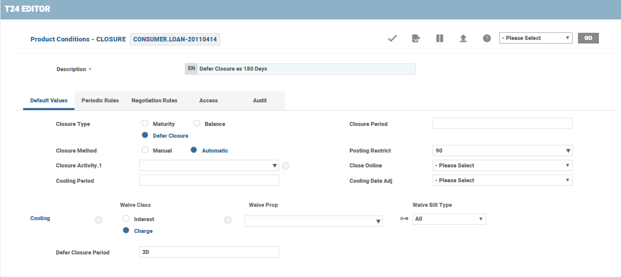 The Closure Property Class is used to close an arrangement if no more transactions happen in that account. In case of non-revolving arrangements, once all balances are settled, arrangement account closure can be triggered anytime manually or automatically. For revolving arrangements, the activity can be triggered on or after maturity. On reversal of a new arrangement, account closure is triggered automatically.