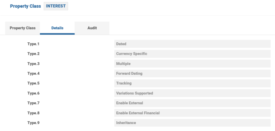 The Type called Inheritance indicates that this Property Class is enabled for Inheritance. The screenshot below displays an example of Interest Property Class definition.